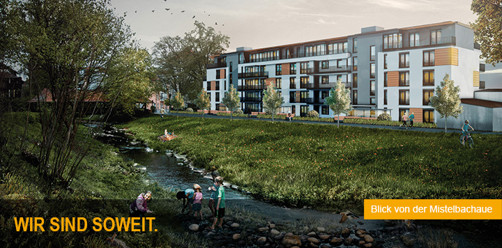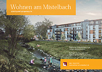 Mit dem Neubau von 31 Wohnungen entlang des Fuß- und Radweges am Mistelbach sowie eines frei stehenden Achtfamilienhauses im Inneren des Areals entsteht das Objekt Wohnen am Mistelbach, das generationsübergreifende Ansprüche mehr als erfüllt.